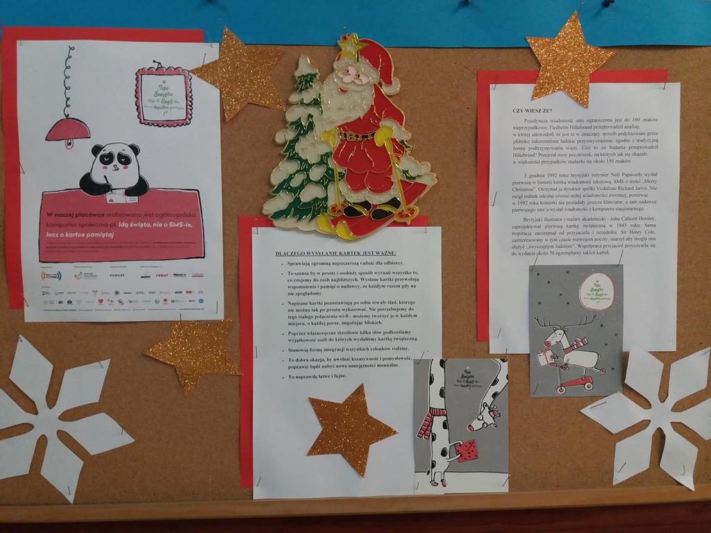 Wraz z Fundacją „Dbam o mój z@sięg” nasza szkoła przystąpiła do działań w ramach kampanii „Idą święta, nie o sms-ie lecz o kartce pamiętaj!”, której celem jest przeciwdziałanie fonoholizmowi oraz e-uzależnieniom u dzieci, wzmacnianie więzi rodzinnych, rozwijanie kreatywności, uzdolnień plastycznych i językowych u dzieci, rozwijanie wrażliwości estetycznej, rozwijanie kompetencji cyfrowych o raz kultywowanie tradycji Świąt Bożego Narodzenia.