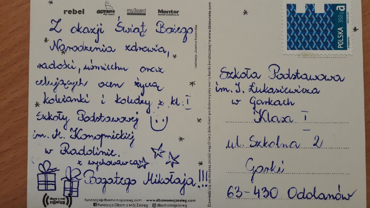 Fundacja przesłała do szkoły kartki świąteczne i plakat z tytułowym hasłem. Naszym zadaniem było zaadresować kartki i wysłać je do osób starszych, samotnych, przebywających w szpitalach, domach opieki społecznej lub do innych instytucji. Co z przyjemnością uczyniliśmy, bo już wiemy dlaczego warto wysyłać kartki, a nie sms-y ! :-) Dlaczego wysyłanie kartek jest takie ważne? Ponieważ sprawiają radość odbiorcy, to szansa aby w prosty i osobisty sposób wyrazić wszystko to, co czujemy do osób najbliższych. Wysłane kartki przywołują wspomnienia i pamięć o nadawcy, za każdym razem gdy na nie spoglądamy. Napisane kartki pozostawiają po sobie trwały ślad, którego nie można tak po prostu wykasować. Nie potrzebujemy do tego stałego połączenia wi-fi, bo możemy tworzyć je w każdym miejscu angażując przy tym bliskich. Poprzez własnoręczne skreślenie kilku słów podkreślamy wyjątkowość osób do których wysłaliśmy kartkę świąteczną.
