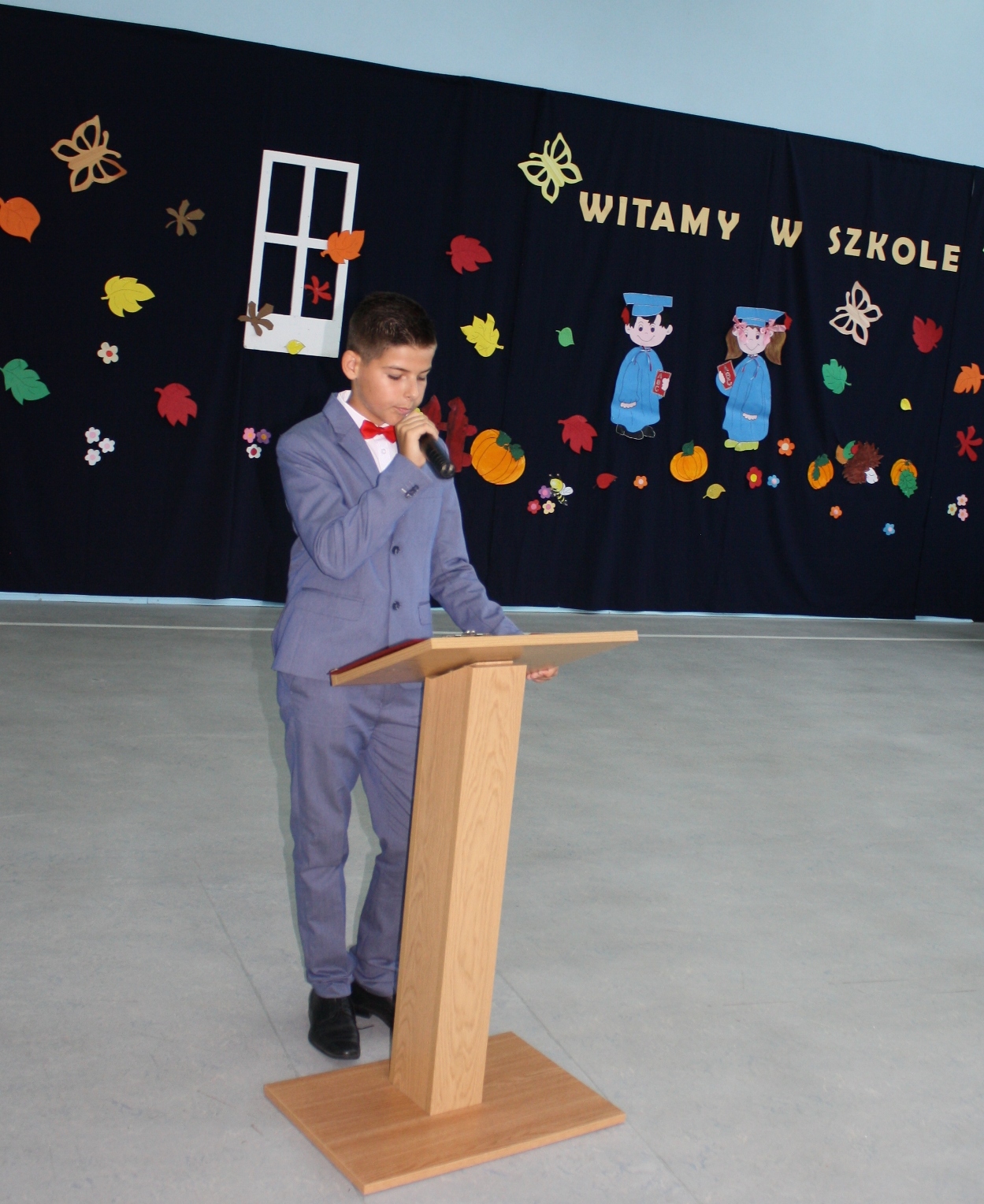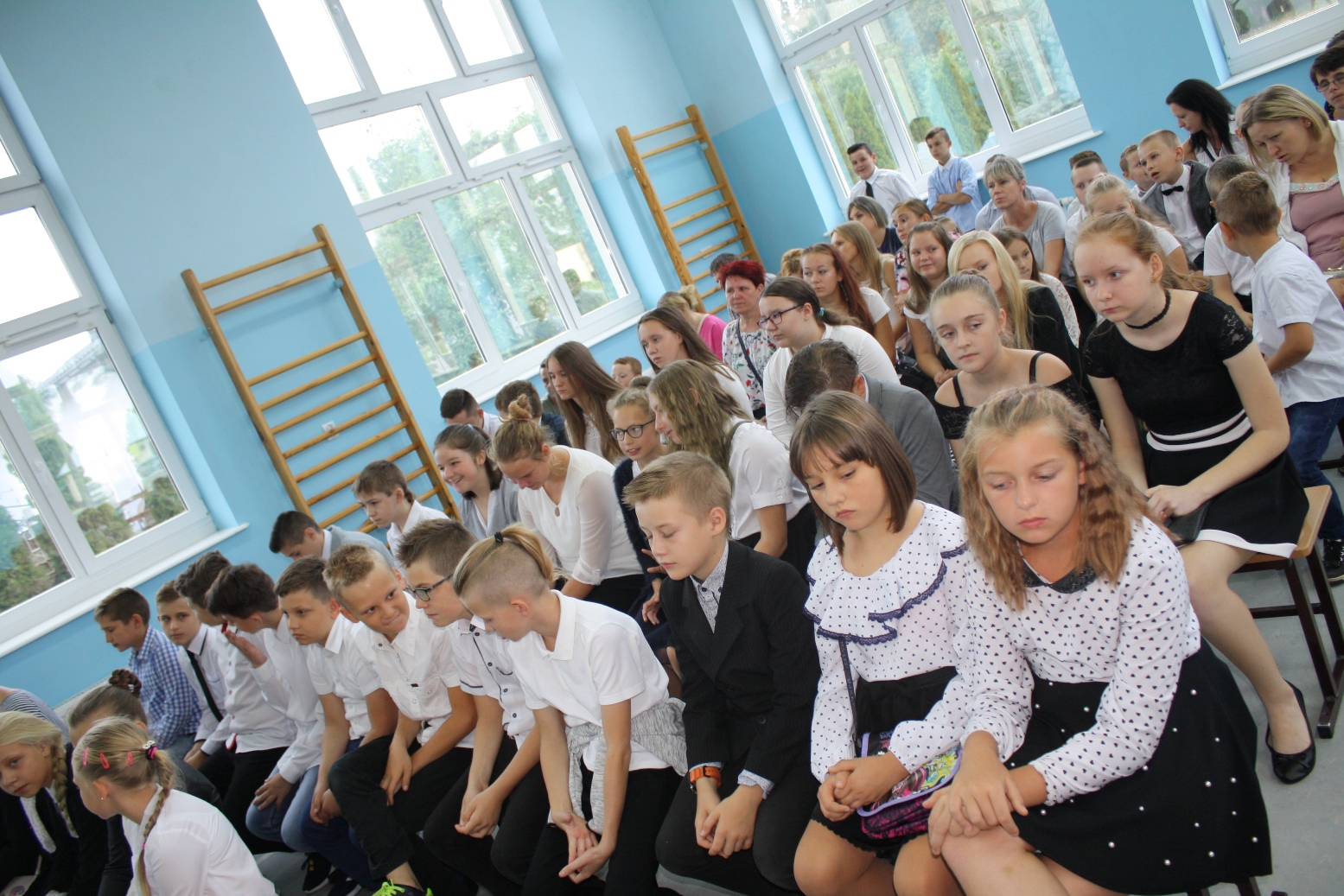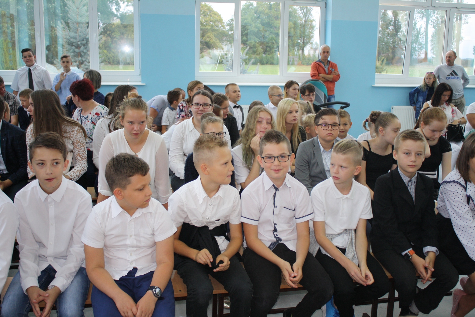 Dzieci i ich rodziców, zebranych w sali gimnastycznej, przywitała Dyrektor Szkoły, pani Alina Kozłowska. Pani Dyrektor ciepłe słowa skierowała szczególnie do uczniów klasy pierwszej i czwartej, którzy rozpoczną swoją edukację pod opieką nowej wychowawczyni. Przedstawiła również nauczycieli, którzy będą pełnić wychowawstwo w pozostałych klasach. Złożyła również u progu nowego roku szkolnego życzenia: Nauczycielom - satysfakcji z wykonywanej pracy; inspiracji do wprowadzania nowych rozwiązań metodycznych na zajęciach z dziećmi i młodzieżą oraz dobrej atmosfery pracy. Niech uda się Państwu zrealizować wszystkie zamierzenia, zarówno w życiu zawodowym, jak i osobistym. Uczniom życzył, by potrafili w pełni wykorzystać czas przeznaczony na naukę, by umieli rozwijać swoje zainteresowania artystyczne i sportowe, by we właściwy sposób decydowali o dalszych losach edukacyjnych i zawodowych.Do Rodziców natomiast Pani Dyrektor skierowała życzenia, by nowy rok szkolny przyniósł wiele okazji do dumy i radości z osiągnięć dzieci. Wyraziła wiarę, że nasza szkoła będzie dla Rodziców miejscem otwartym i przyjaznym. Życzyła również dobrej współpracy z nauczycielami, wychowawcami i opiekunami.