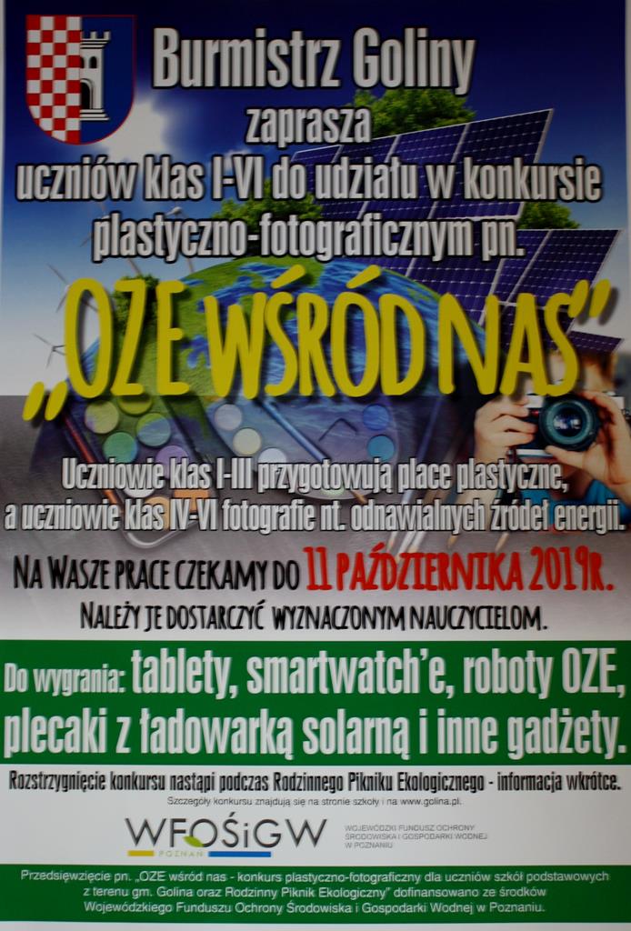 Burmistrz Goliny zaprasza uczniów klasy I-VI do udziału w konkursie plastyczno-fotograficznym pn. "OZE WŚRÓD NAS". Szczegóły konkursu znajdują się w załącznikach.