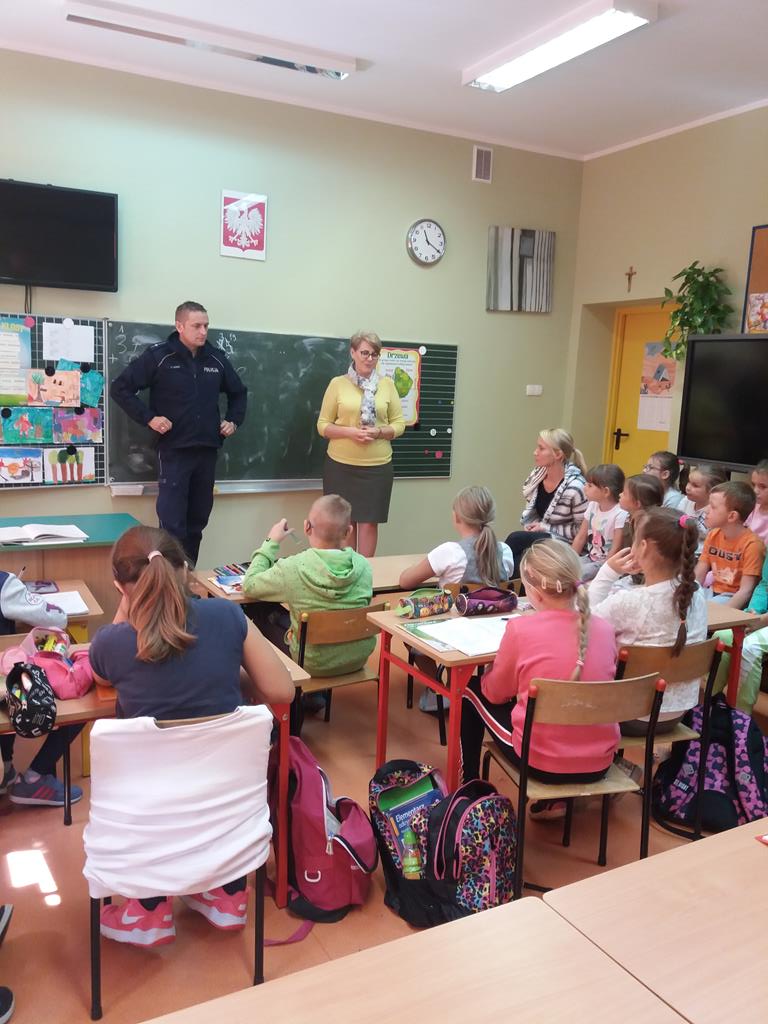 18 września 2019 r. gościliśmy w naszej szkole pana dzielnicowego Marcina Nowaka, który mówił o zachowaniu bezpieczeństwa w drodze do szkoły. Pan policjant omówił zasady bezpiecznego uczestnictwa w ruchu drogowym, w jaki sposób należy poruszać się po chodniku, jezdni, a także jak prawidłowo przechodzić przez jezdnię, korzystać z sygnalizacji świetlnej i jeździć rowerem. Uczniowie utrwalili sobie wszystkie informacje, zadawali naszemu gościowi mnóstwo pytań. Spotkanie przyczyniło się do wzrostu świadomości zachowań ryzykownych oraz bezpiecznych wśród dzieci.