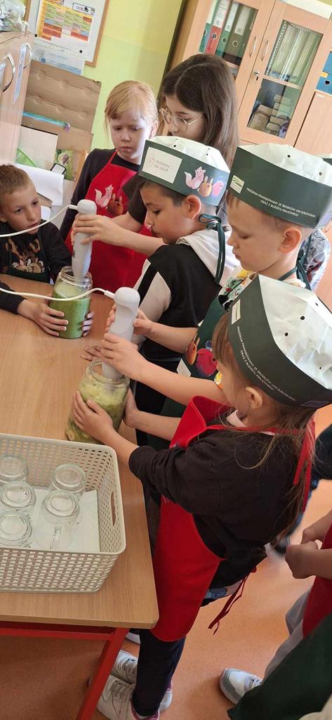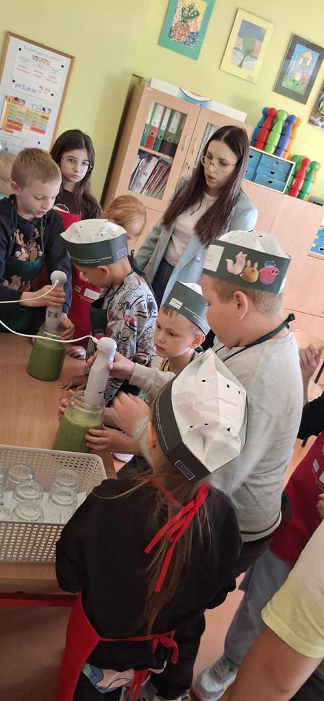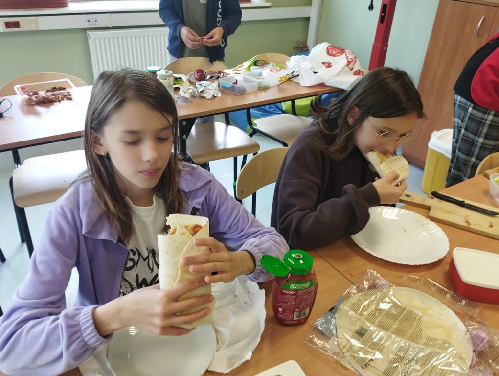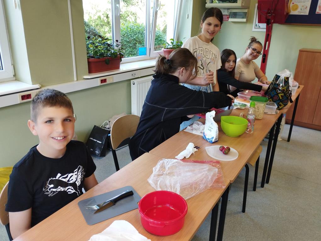 Uczniowie klas 5 i 6 w ramach zajęć techniki przygotowali zdrowe i smaczne posiłki – kolorowe tortille z warzywami, sałatki owocowe oraz kluski z truskawkami. Zajęcia miały na celu nie tylko rozwijanie umiejętności kulinarnych, ale również promowanie zdrowego stylu życia. Działania wpisują się w realizację podstawy programowej oraz inicjatywę Szkoły Promującej Zdrowie.