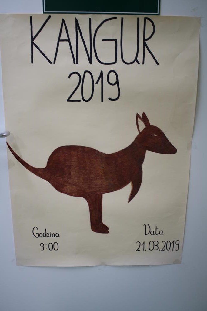 21 marca 2019 roku o godzinie 9.00 uczniowie naszej szkoły przystąpili do Międzynarodowego Konkursu Matematycznego „Kangur”. Celem Konkursu jest propagowanie kultury matematycznej w jak najszerszych kręgach uczniów szkół wszystkich typów. W konkursie wzięło udział 7 uczniów szkoły. Uczniowie pisali konkurs w różnych kategoriach: Żaczek – 1 uczennica klasy II, Maluch – 1 uczeń klasy IV, Beniamin – 3 uczniów klasy V oraz Kadet – 2 uczniów klasy VII. Zadania nie były łatwe, ogłoszenie wyników dopiero w maju. Trzymamy kciuki!!! Każdy uczestnik konkursu dostał upominek. Inicjatorem Międzynarodowego Konkursu Matematycznego „Kangur Matematyczny” jest Stowarzyszenie „Kangourou Sans Frontieres” z siedzibą w Paryżu. Konkurs przeprowadzany jest jeden raz w roku jednocześnie we wszystkich uczestniczących w nim krajach. W Polsce głównym organizatorem konkursu jest Towarzystwo Upowszechniania Wiedzy i Nauk Matematycznych z siedzibą w Toruniu pod patronatem Matematyki i Informatyki Uniwersytetu Mikołaja Kopernika w Toruniu oraz Polskiego Towarzystwa Matematycznego.