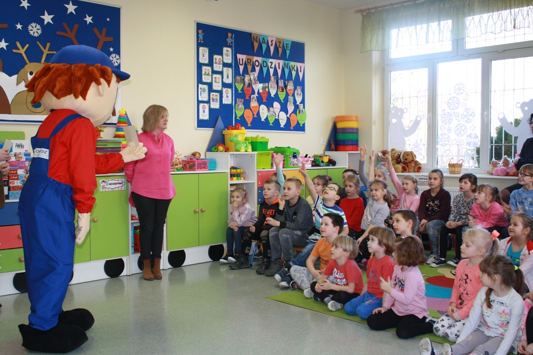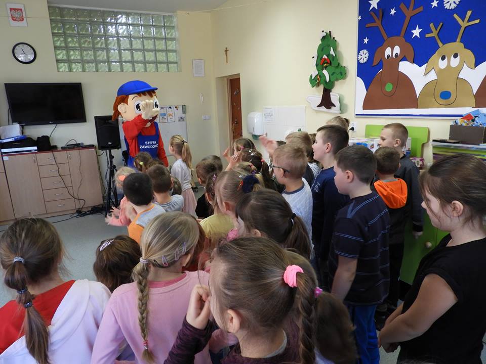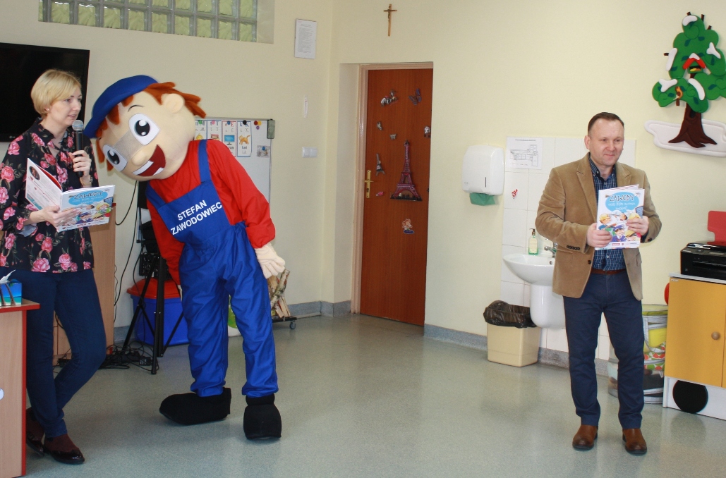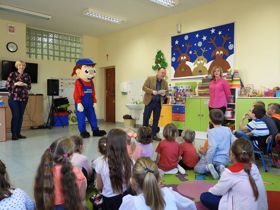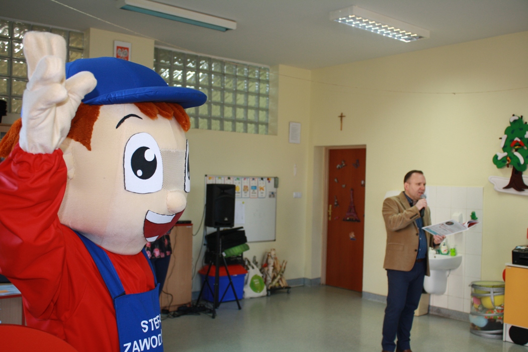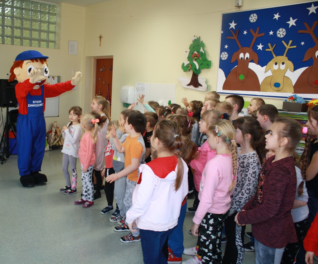 27 lutego do naszej szkoły zawitał Stefan Zawodowiec z Centrum Wsparcia Rzemiosła Kształcenia Dualnego i Zawodowego w Koninie, który rozmawiał z dziećmi na temat różnych zawodów, czytał zagadki i odpowiadał na pytania. Dzieciaki dzieliły się swoją wiedzą o zawodach i chętnie brały udział w zabawie ze Stefanem Zawodowcem.