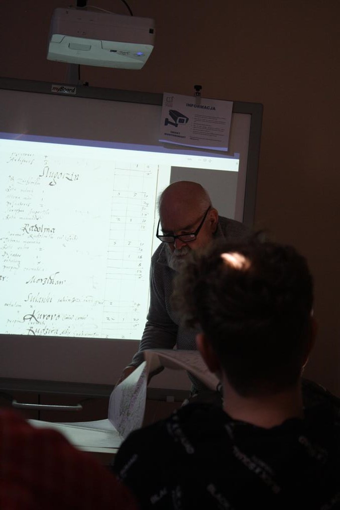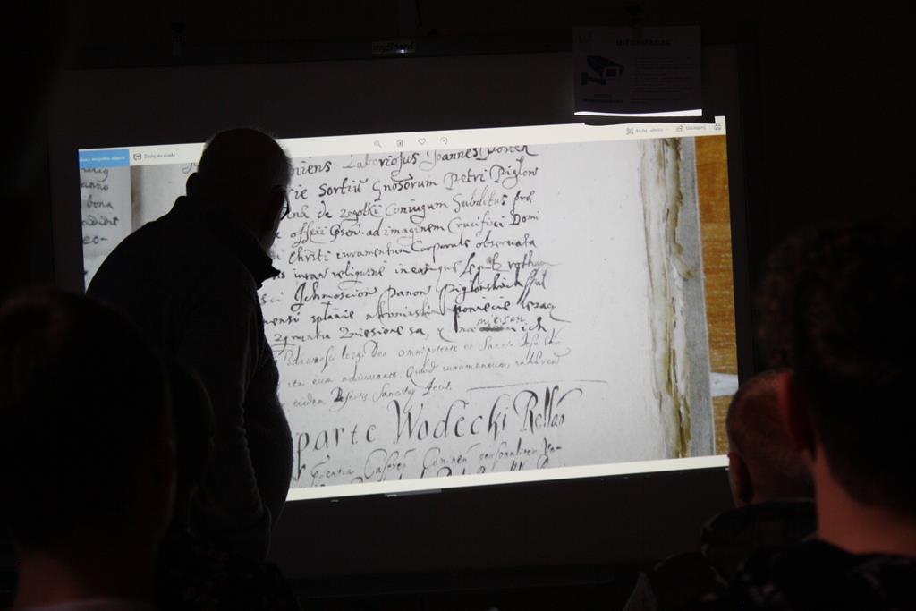Uczniowie z zainteresowaniem słuchali o przeszłości Radoliny - wsi szlacheckiej znajdującej się w parafii Myślibórz, znanej w źródłach pisanych od XIV w. Jej historia przyciąga uwagę ze względu na postać Piotra Wysza z Radoliny, biskupa krakowskiego i poznańskiego zmarłego w 1414r. Dostojnik Kościoła był również pierwszym kanclerzem odnowionego Uniwersytetu Krakowskiego. Ósmoklasiści odczytywali informacje ze średniowiecznych ksiąg oraz dowiedzieli się, w jaki sposób odnaleźć je w Internecie.