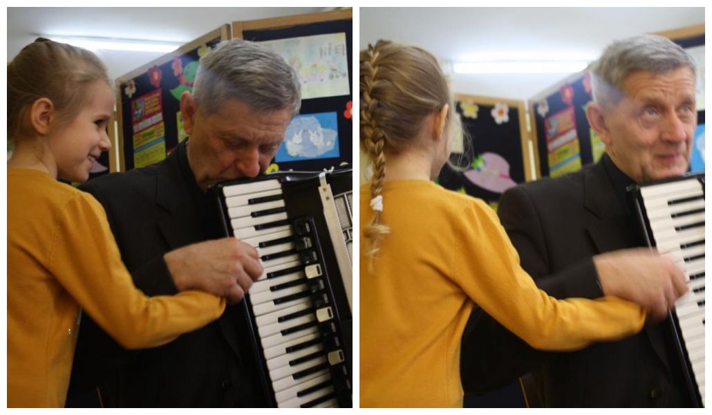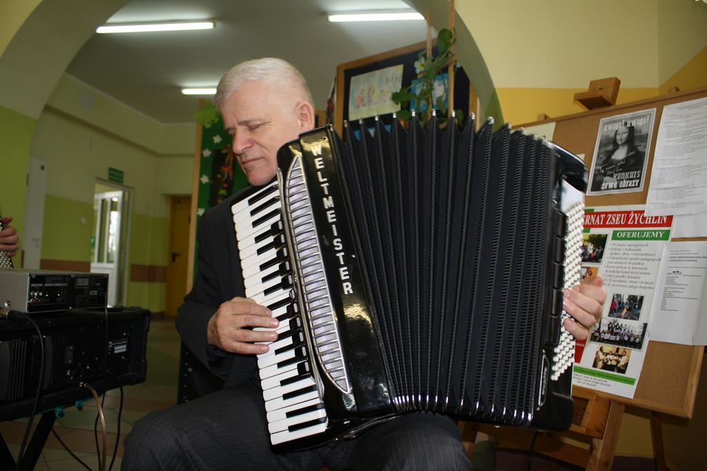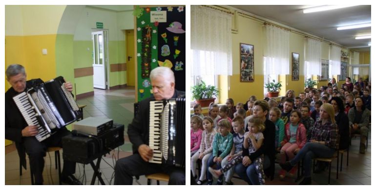 12 marca 2019r. w murach naszej szkoły gościliśmy duet akordeonowy z Łodzi: pana Zbigniewa Sobieraja i pana Kazimierza Barasińskiego. Muzycy zaprosili przedszkolaków i uczniów wraz z nauczycielami do aktywnego przeżywania muzyki na żywo. Przedstawili największe przeboje muzyki klasycznej znanych kompozytorów z elementami ilustracyjnymi. Dzieci rozpoznawały i nazywały także zaprezentowane tańce narodowe i zagraniczne. Miały również niepowtarzalną okazję poznania akordeonu jako instrumentu dętego miechowego, jego budowę i możliwości wykonawcze. Nie obyło się bez prostych elementów ruchowych chętnych uczniów i zabawy przy muzyce.