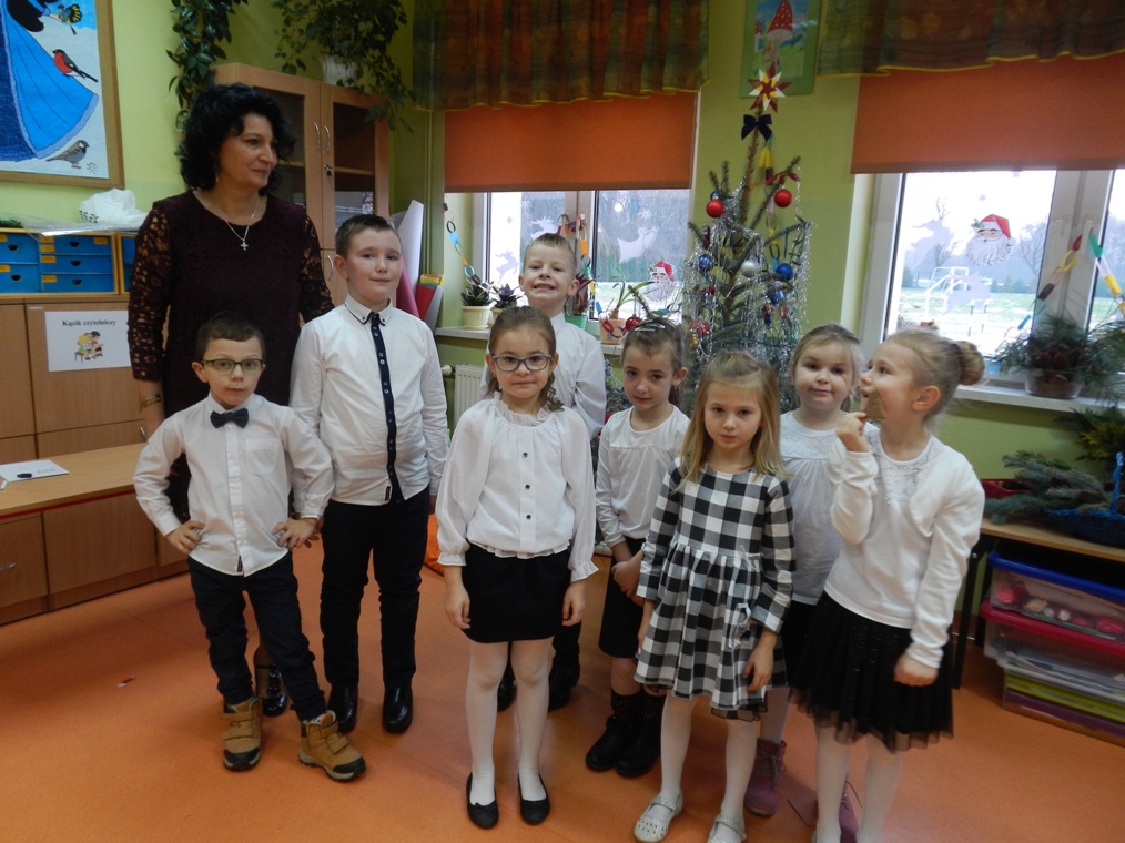 Zanim jednak rozpoczęło się przedstawienie bożonarodzeniowe w świat zimowej krainy wprowadziły nas przedszkolaki prezentując montaż słowno-muzyczny pt. „Co słychać u bałwanków”, zaśpiewały też piosenki o bałwankach, recytowały wierszyki oraz zaśpiewały kolędę „Tryumfy Króla Niebieskiego”.