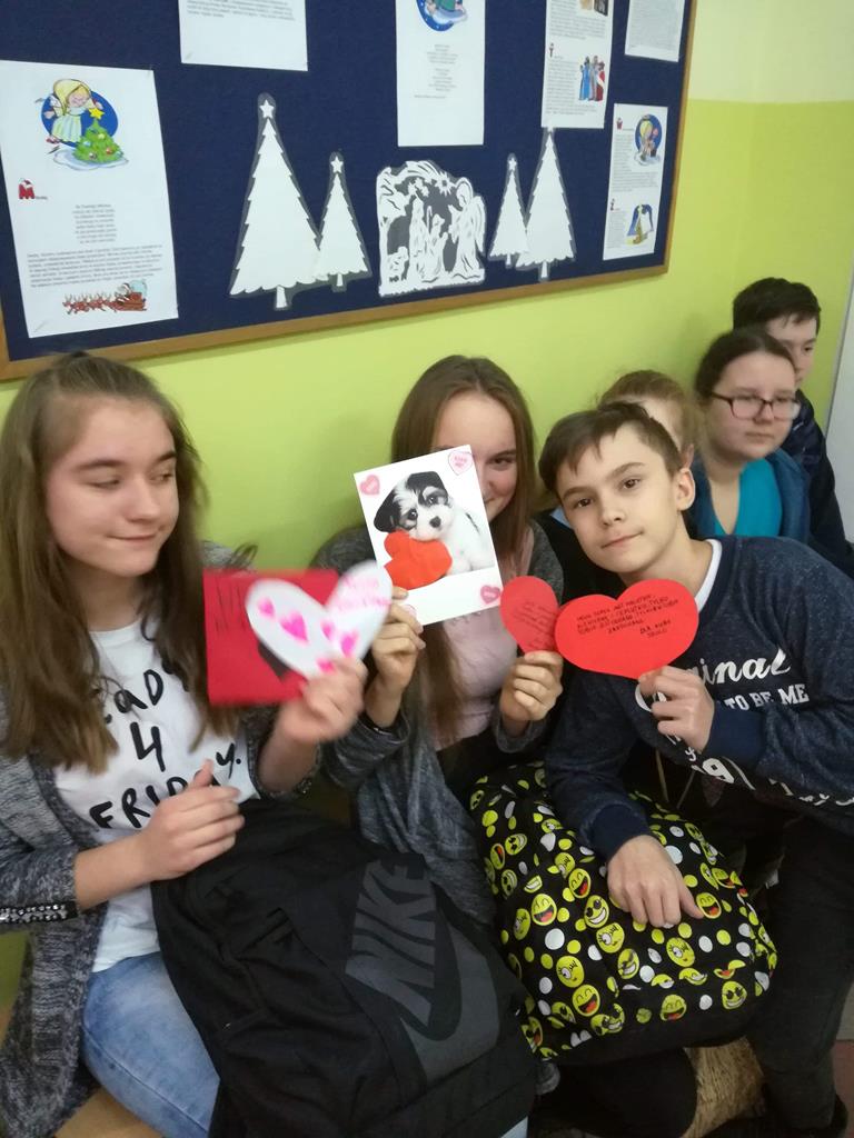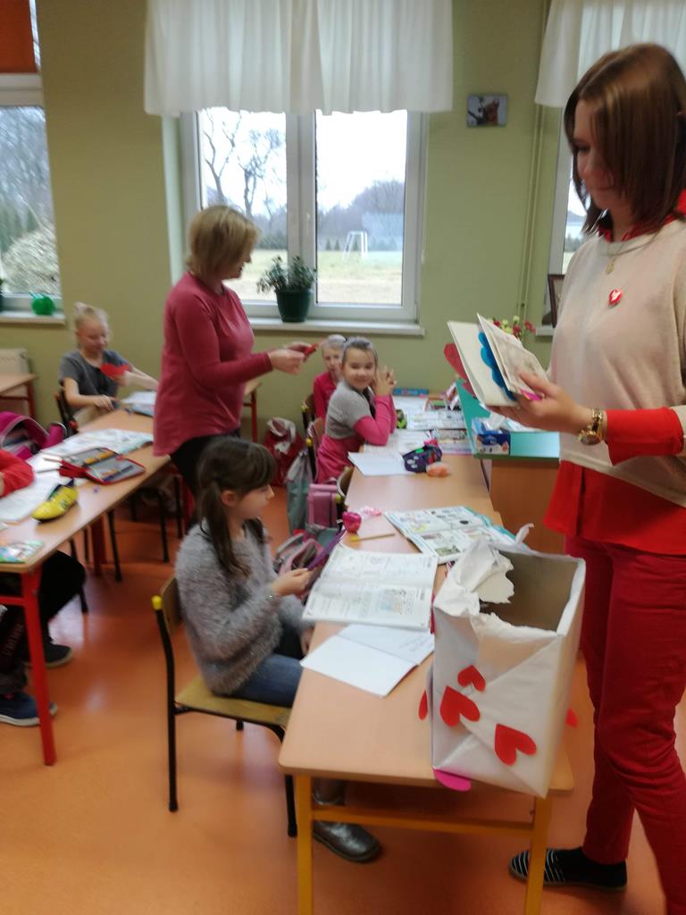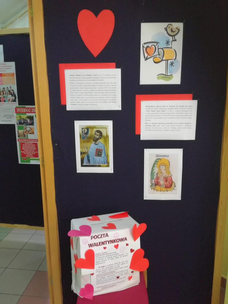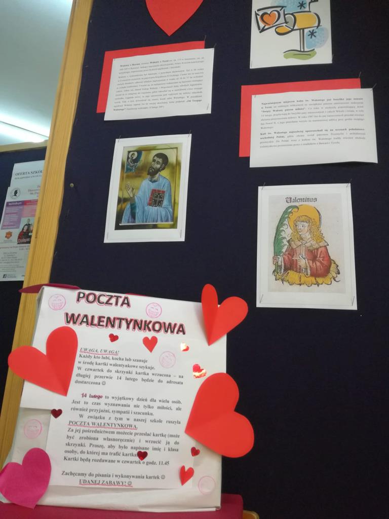 Na korytarzach szkolnych w tym dniu gościł kolor czerwony lub elementy stroju w tym kolorze np. opaska, papierowe serce. Bibliotekarz szkolny p. Magdalena Lewartowska przygotowała informacje dotyczące osoby Św. Walentego, jego kultu i relikwii. Niewątpliwie największą atrakcją była Poczta walentynkowa. To doskonała okazja , aby wyznać miłość swojej sympatii. Co ważne można to zrobić anonimowo. Miłosne wyznania były zbierane do specjalnego pojemnika , a następnie rozdawane w klasach przez p. Bernadettę Kucharską i panią Emilię Napierałę.
