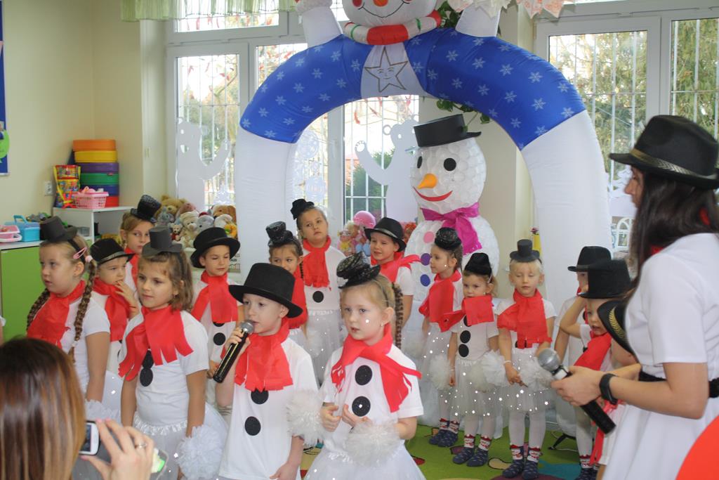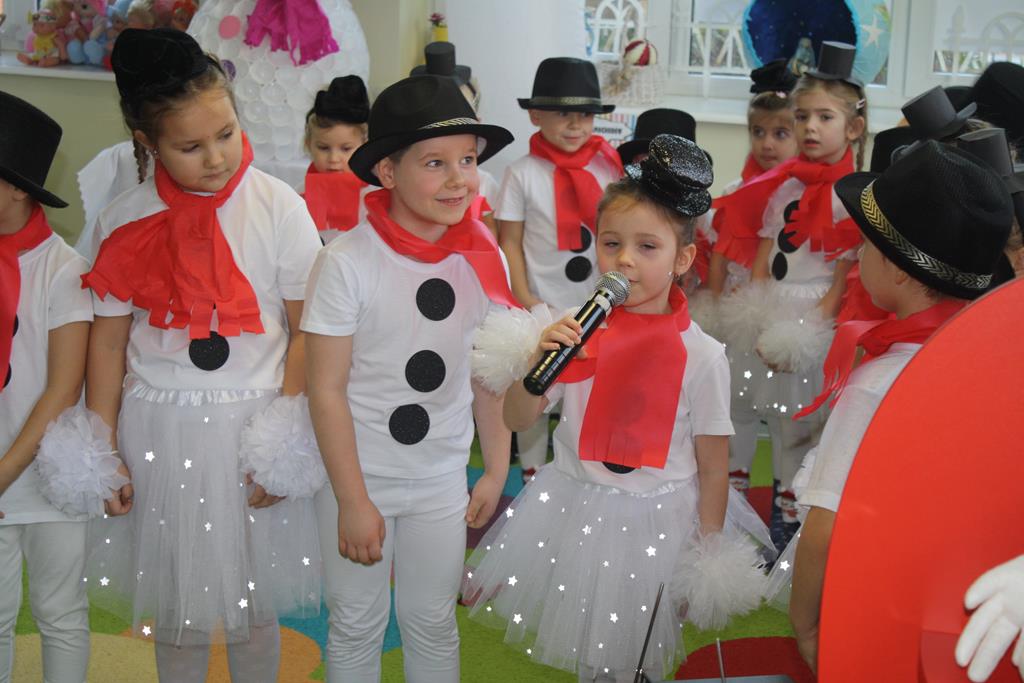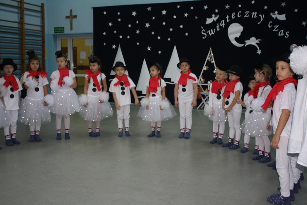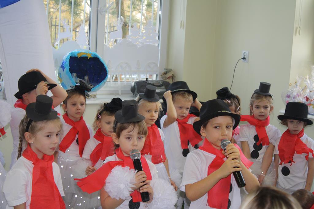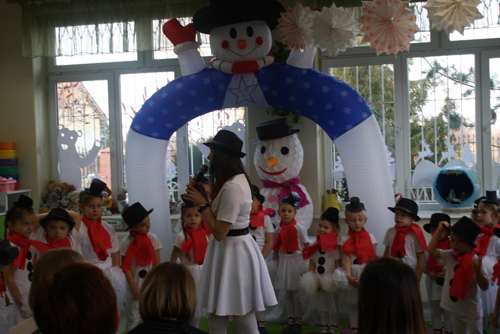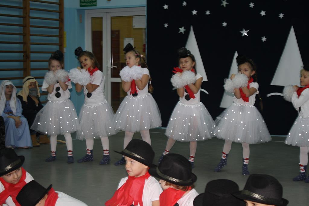 Zanim jednak rozpoczęło się przedstawienie bożonarodzeniowe w świat zimowej krainy wprowadziły nas przedszkolaki prezentując montaż słowno-muzyczny pt. „Co słychać u bałwanków”, zaśpiewały też piosenki o bałwankach, recytowały wierszyki oraz zaśpiewały kolędę „Tryumfy Króla Niebieskiego”.