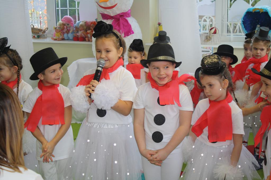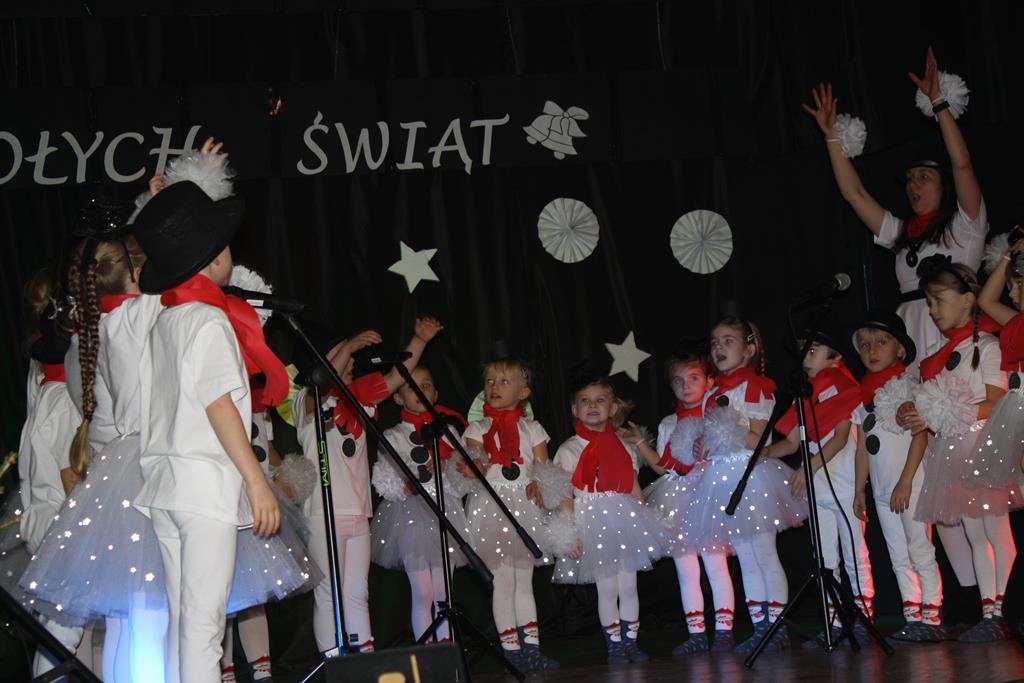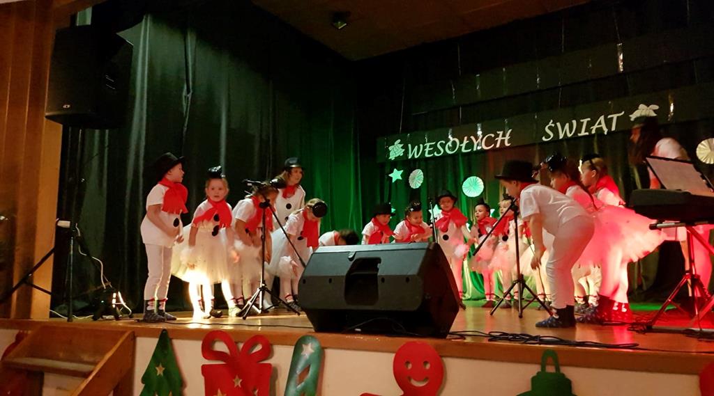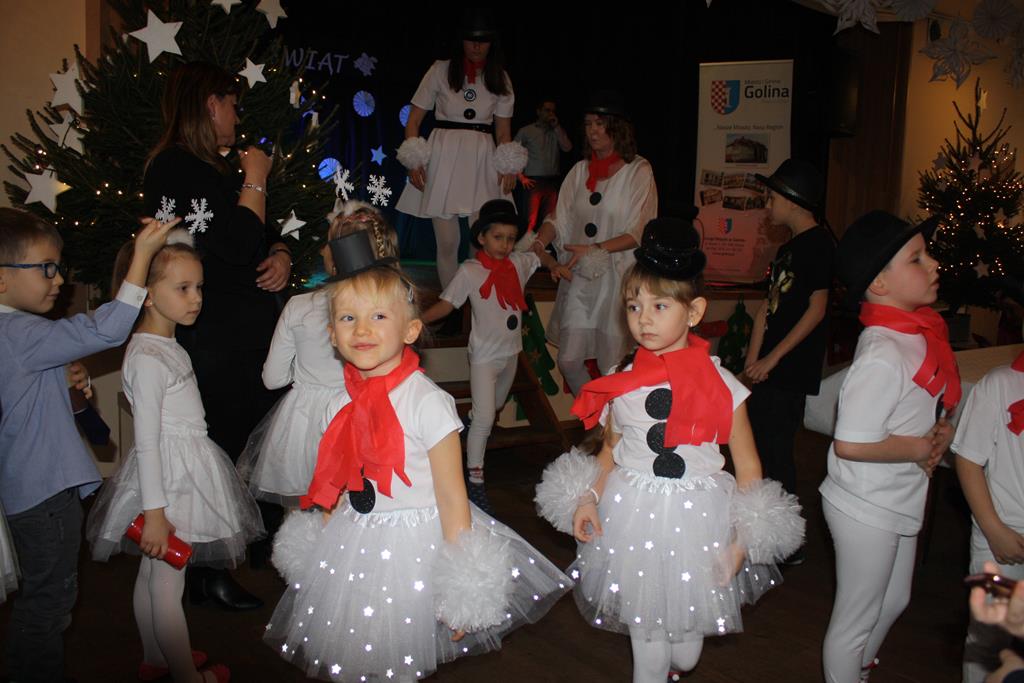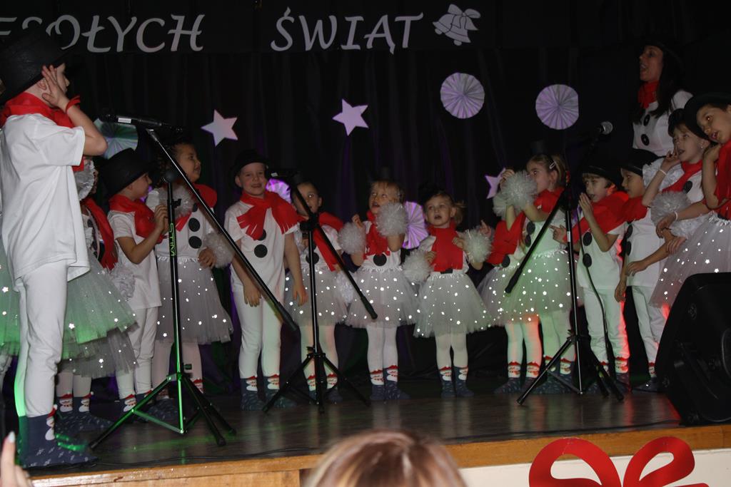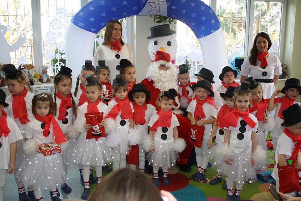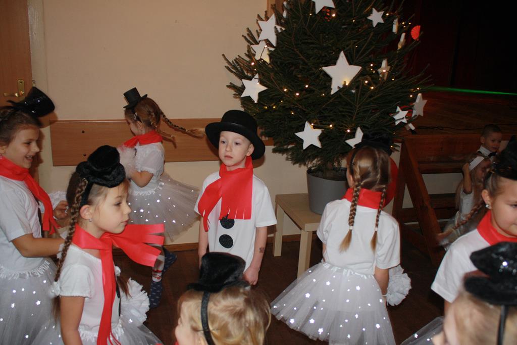 Zanim jednak rozpoczęło się przedstawienie bożonarodzeniowe w świat zimowej krainy wprowadziły nas przedszkolaki prezentując montaż słowno-muzyczny pt. „Co słychać u bałwanków”, zaśpiewały też piosenki o bałwankach, recytowały wierszyki oraz zaśpiewały kolędę „Tryumfy Króla Niebieskiego”.