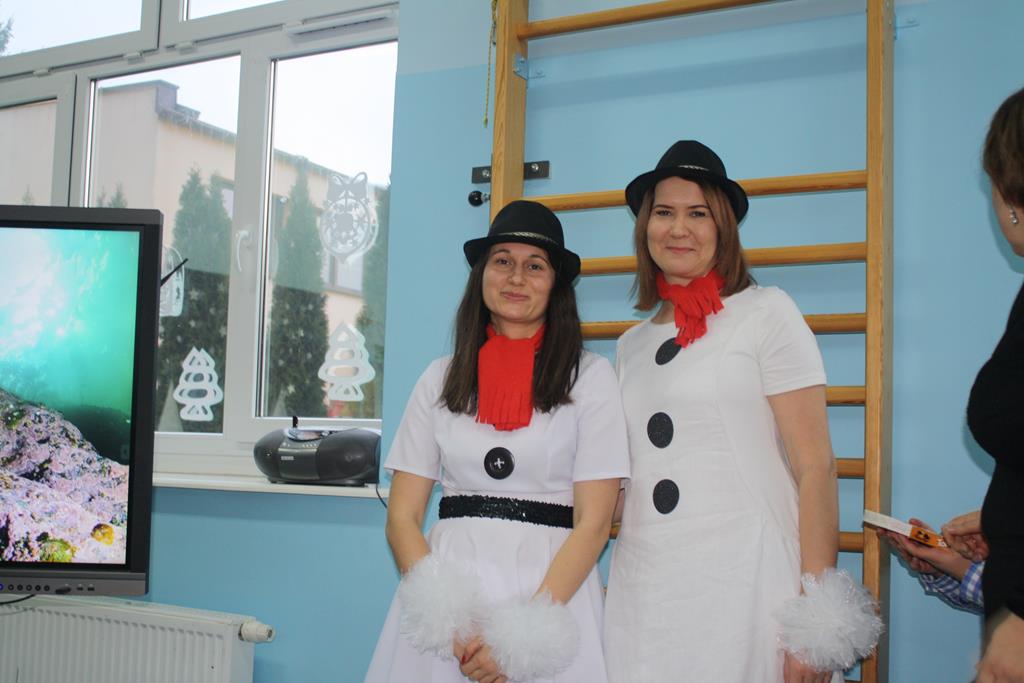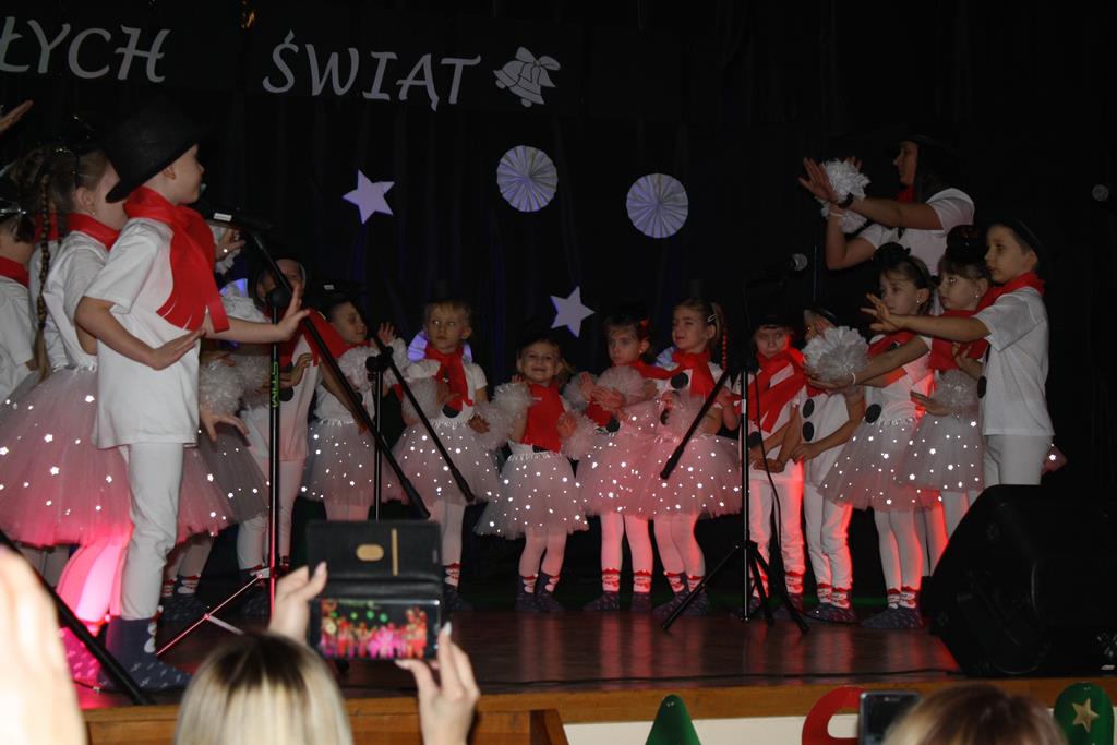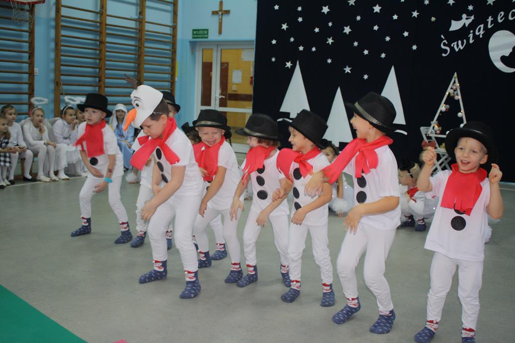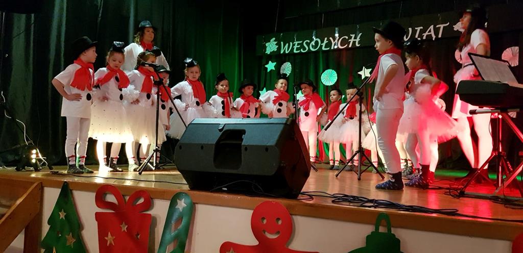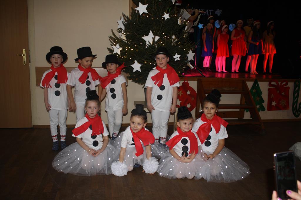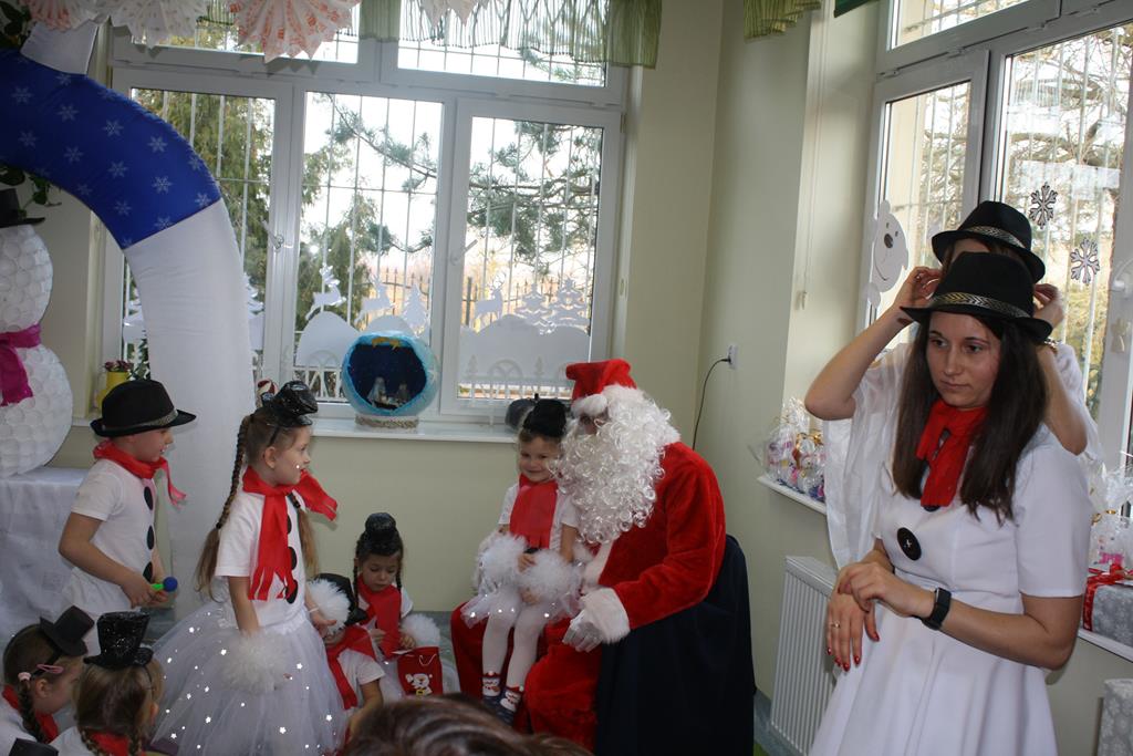 Zanim jednak rozpoczęło się przedstawienie bożonarodzeniowe w świat zimowej krainy wprowadziły nas przedszkolaki prezentując montaż słowno-muzyczny pt. „Co słychać u bałwanków”, zaśpiewały też piosenki o bałwankach, recytowały wierszyki oraz zaśpiewały kolędę „Tryumfy Króla Niebieskiego”.