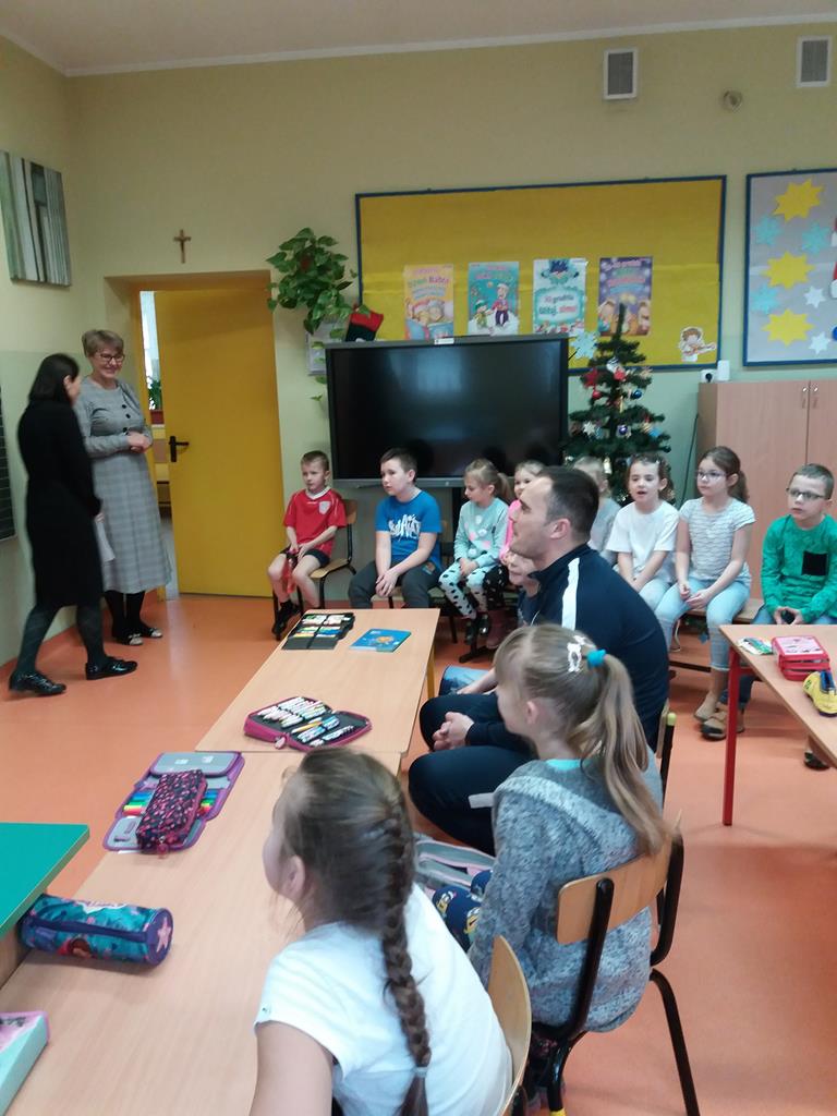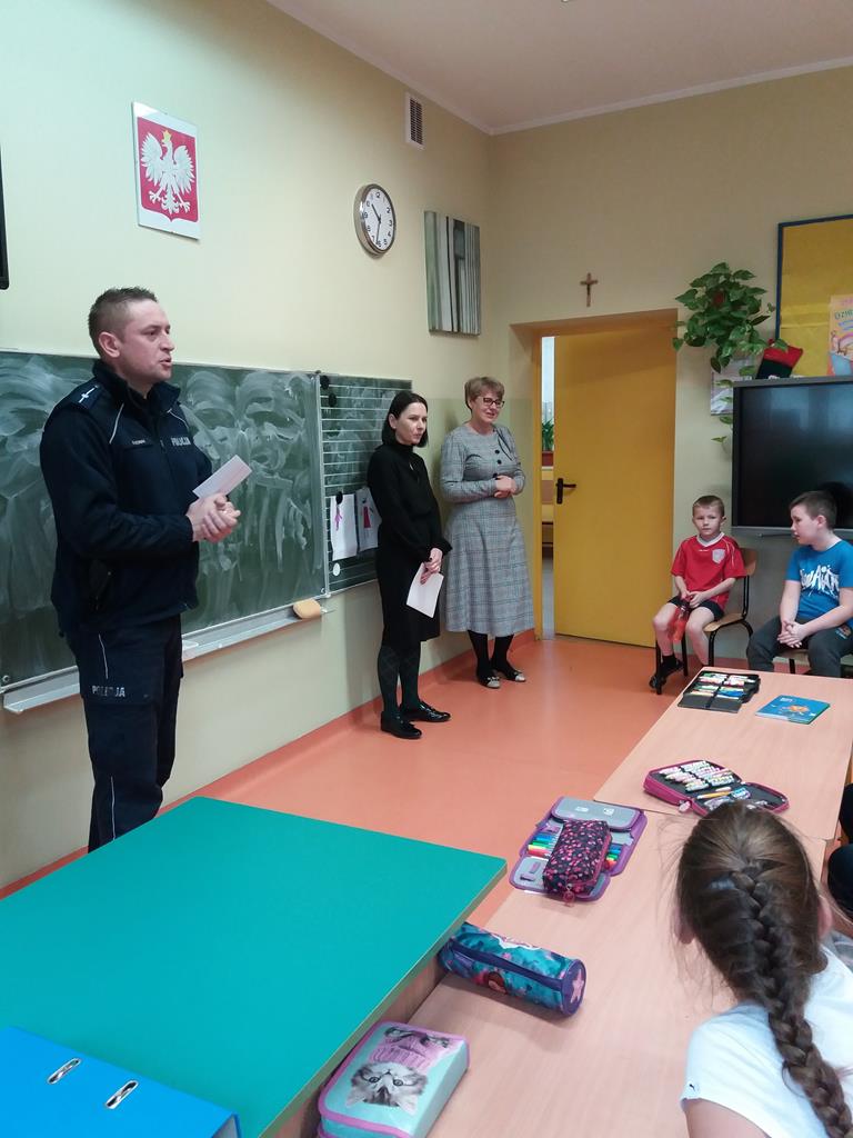 Ferie są czasem relaksu i odpoczynku dla naszych uczniów, ale ważne jest zachowanie bezpieczeństwa podczas zimowych zabaw, zwłaszcza przy wchodzeniu na kruchy lód. Pan dzielnicowy Marcin Nowak uświadamiał uczniom także przykre skutki zabaw w niedozwolonych miejscach oraz zachowaniu ostrożności w pobliżu jezdni. Dzieci utrwaliły sobie wszystkie informacje, zadawały naszemu gościowi mnóstwo pytań aktywnie biorąc udział w rozmowie. Mamy nadzieję, że po zimowym odpoczynku wrócą całe i zdrowe, z energią do dalszej nauki.