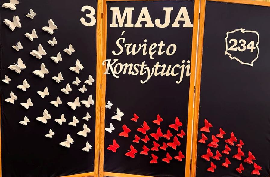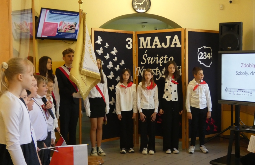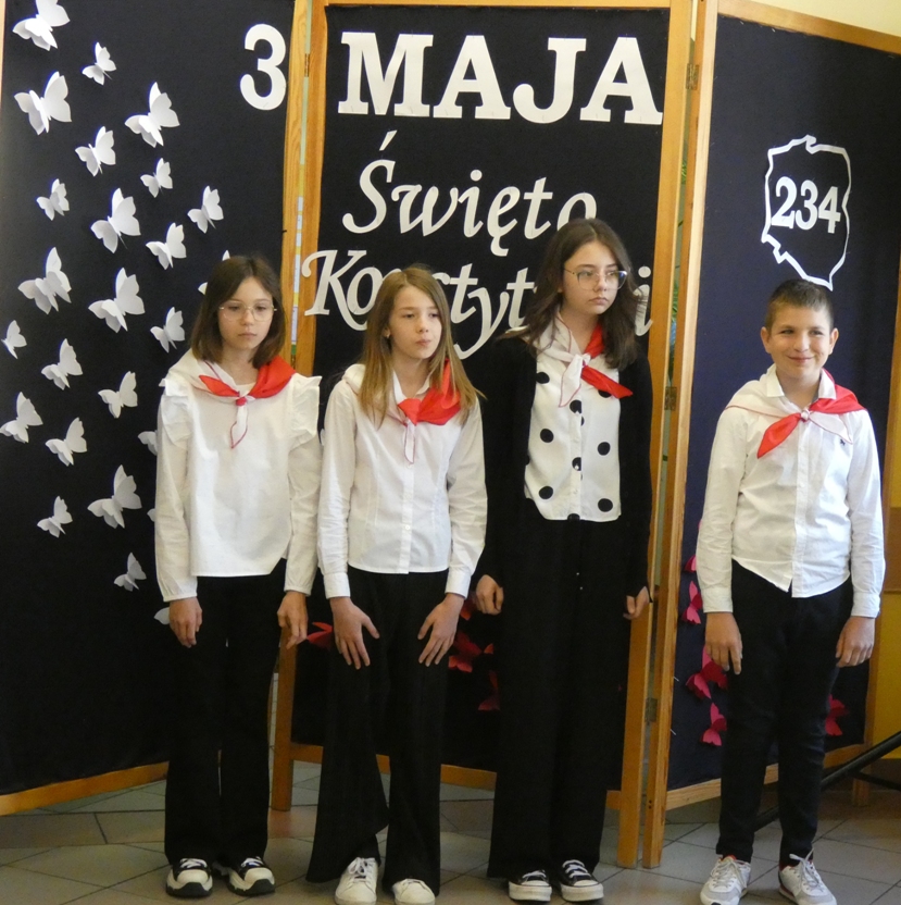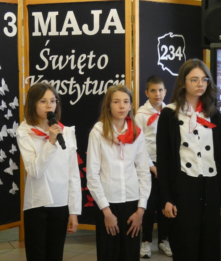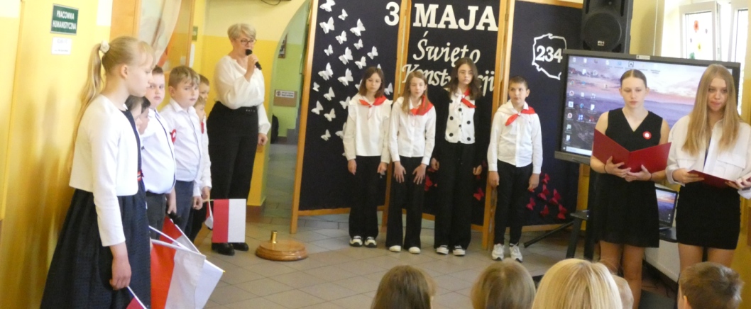 W dniu 30.04 w naszej szkole odbyła się uroczystość z okazji 234. rocznicy uchwalenia Konstytucji 3 Maja – pierwszej w Europie i drugiej na świecie spisanej konstytucji. Z tej okazji uczniowie przypomnieli historię tego ważnego dokumentu oraz jego autorów: króla Stanisława Augusta Poniatowskiego, Hugo Kołłątaja, Ignacego Potockiego i Stanisława Małachowskiego. Występom towarzyszyła recytacja wierszy, pieśni patriotyczne oraz wprowadzenie sztandaru Szkoły Podstawowej im. Marii Konopnickiej.