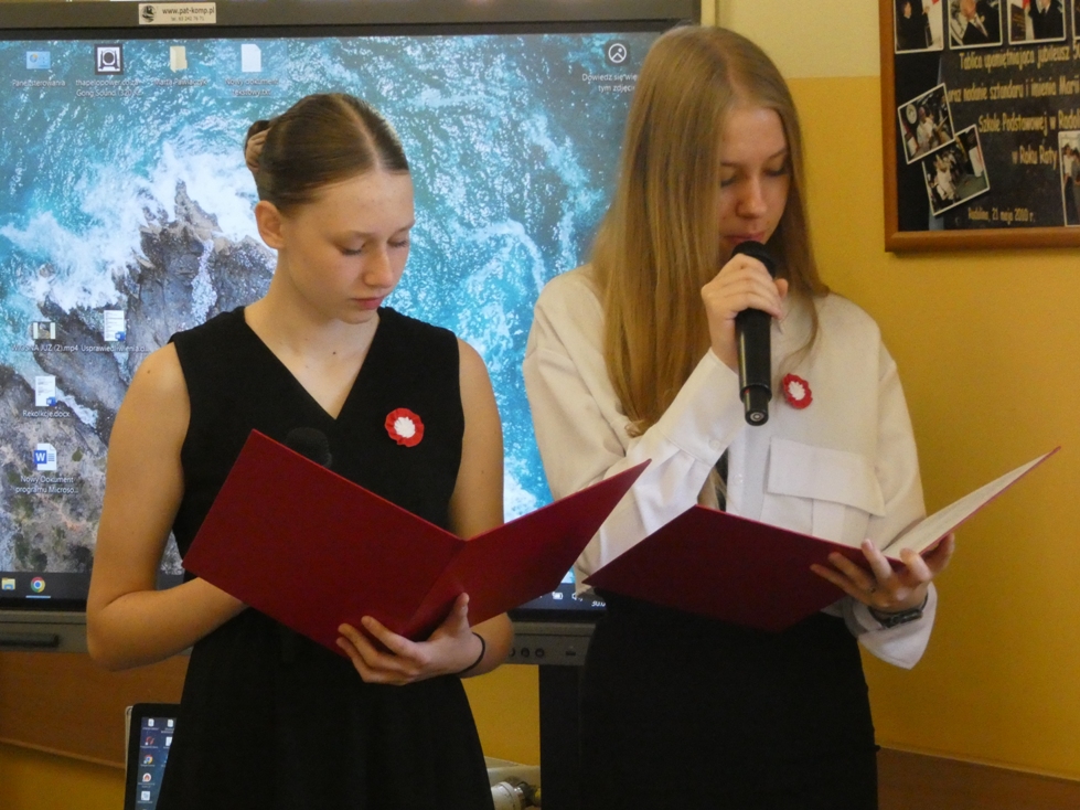 Szkolną uroczystość z okazji Dnia Patrona rozpoczęliśmy od odśpiewania ,,Roty” – utworu napisanego przez naszą patronkę - Marię Konopnicką - w 1908 roku jako wyraz protestu przeciwko nasilającej się germanizacji i stanowiącej po dziś dzień prawdziwy symbol polskiego patriotyzmu.