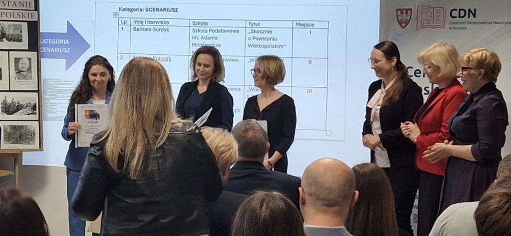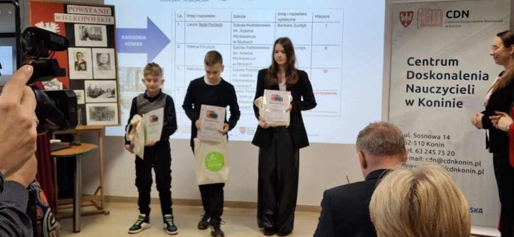 W poniedziałek 24 marca 2025r. w Centrum Doskonalenia Nauczycieli w Koninie odbyło się uroczyste podsumowanie Wojewódzkiego Konkursu „Strażnicy Powstania Wielkopolskiego 1918-1919”. Cztery uczennice z klasy ósmej Szkoły Podstawowej w Radolinie: Zuzanna Kurleto, Paulina Czerniak, Wiktoria Urbańska i Dominika Grzesiak wzięły udział w konkursie, podejmując wyzwanie w kategorii plakat dotyczący powstania wielkopolskiego. Zuzanna Kurleto otrzymała wyróżnienie, odebrała dyplom i nagrodę wraz z nauczycielem historii p. Karoliną Kulczak, która uzyskała II miejsce w kategorii scenariusz uroczystości szkolnej.