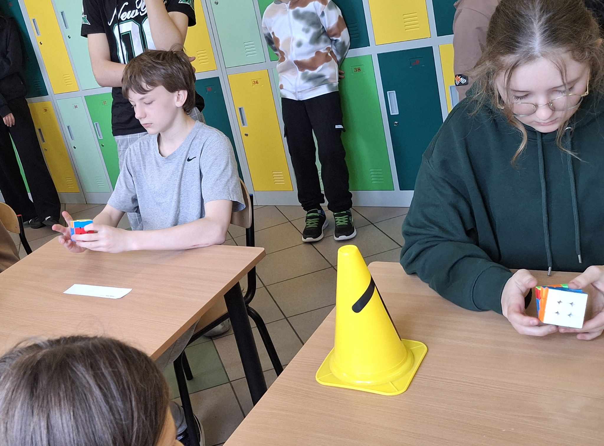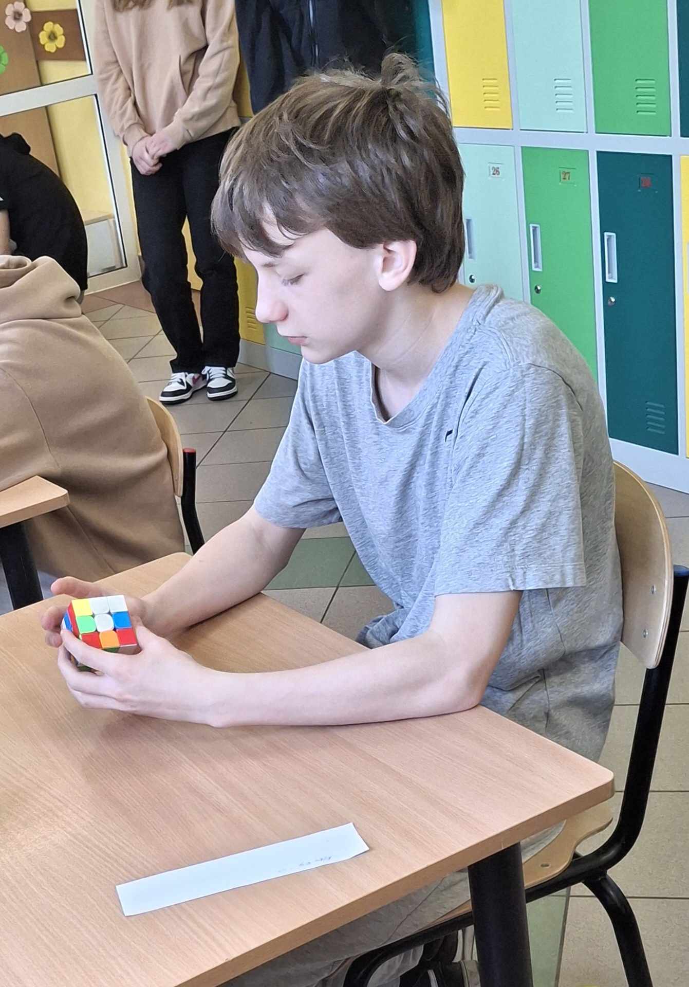 Do rywalizacji stanęło kilkoro uczniów z różnych klas, którzy zmierzyli się w dwóch rundach, walcząc o tytuł najszybszego układacza kostki. Emocje sięgały zenitu, a widownia z zapartym tchem śledziła każde obroty kolorowych ścianek. Najlepsze czasy, poniżej minuty należały do uczniów : Weroniki Żabierek ( 50,68s), , Kaspiana Gomulskiego (56,12 s.) i Nadii Szczepańskiej ( 63,26s. )