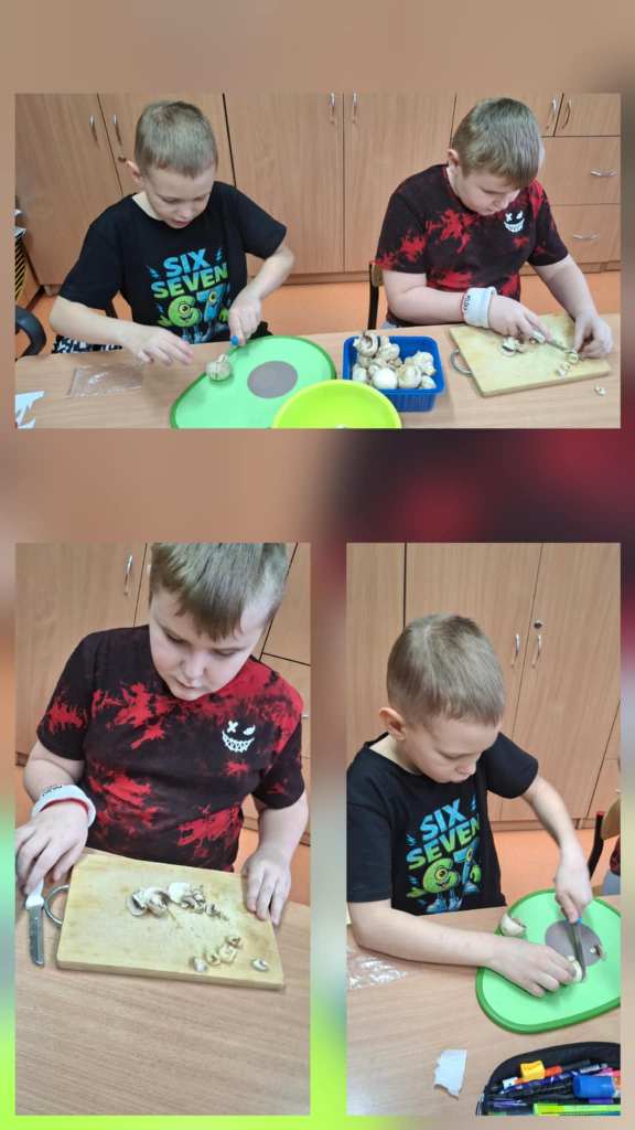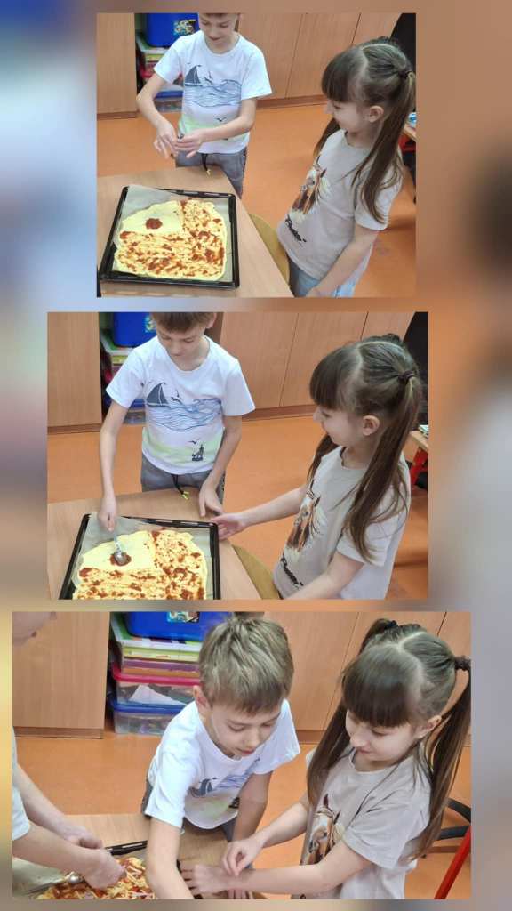 Po wyrośnięciu ciasta rozłożyliśmy je na blaszkach, a następnie uczniowie komponowali swoje ulubione dodatki. Wspólne gotowanie było doskonałą okazją do nauki współpracy, rozwijania samodzielności oraz kształtowania umiejętności kulinarnych.