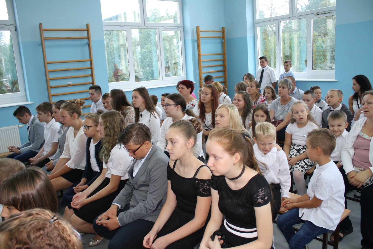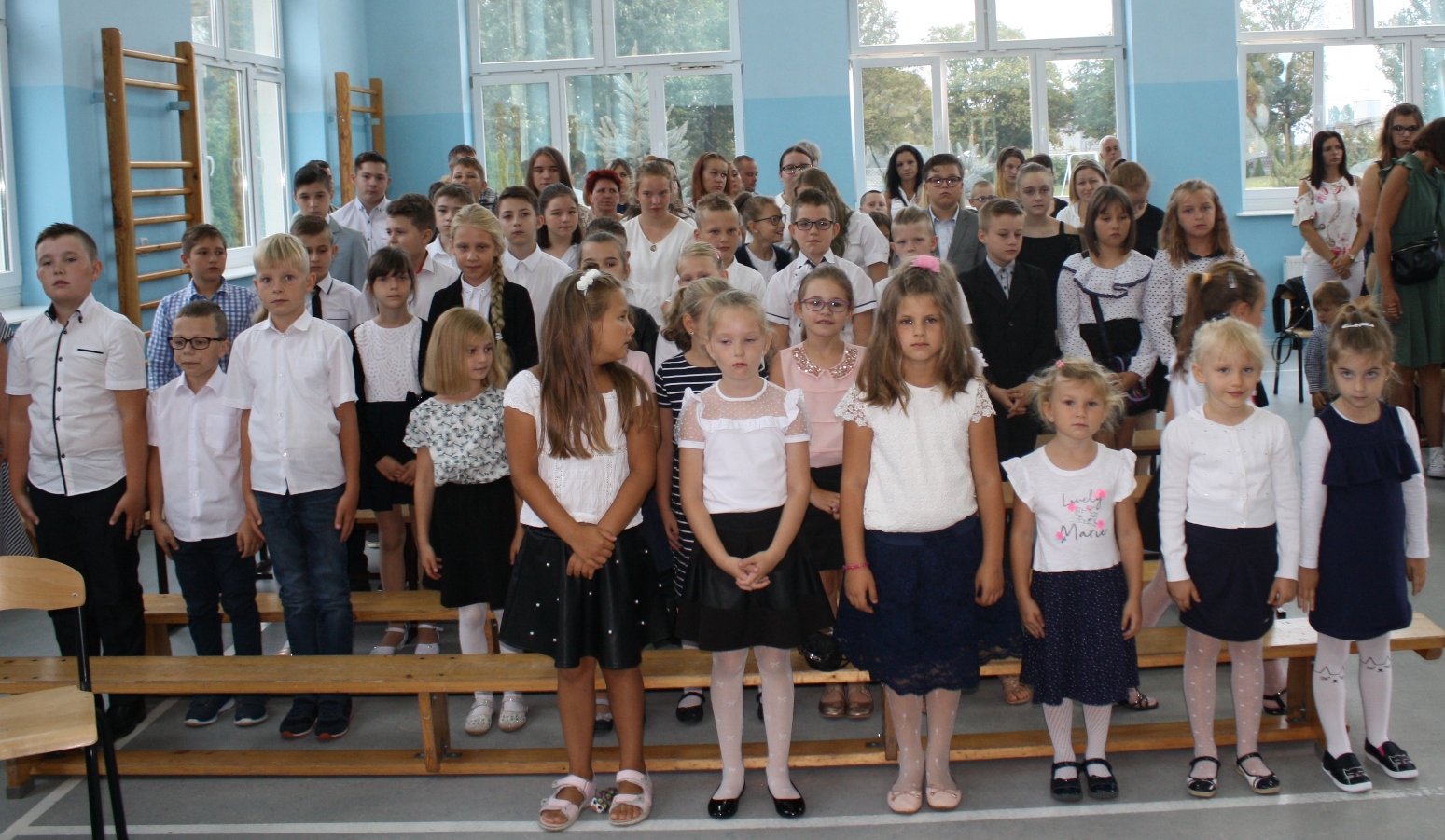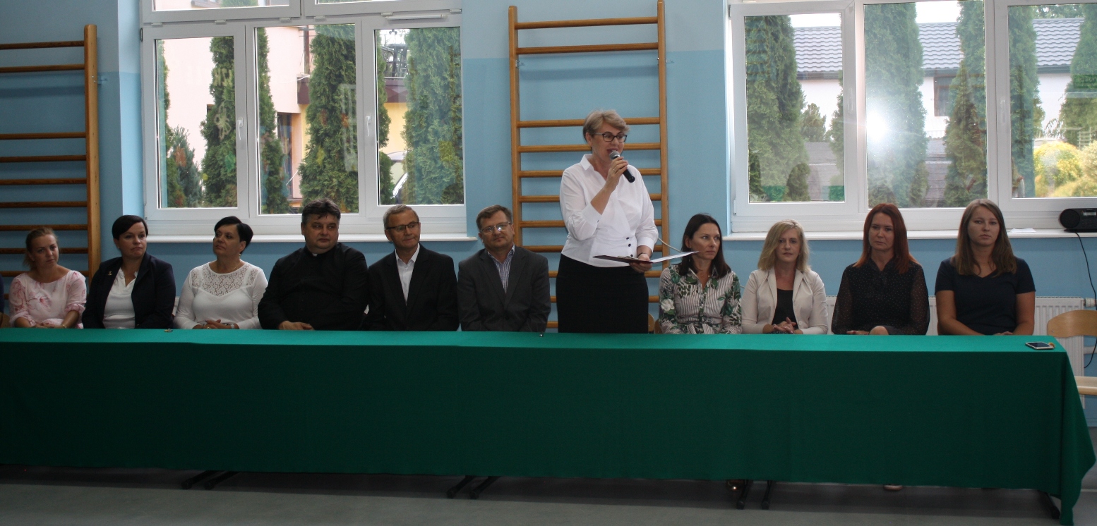 Dzieci i ich rodziców, zebranych w sali gimnastycznej, przywitała Dyrektor Szkoły, pani Alina Kozłowska. Pani Dyrektor ciepłe słowa skierowała szczególnie do uczniów klasy pierwszej i czwartej, którzy rozpoczną swoją edukację pod opieką nowej wychowawczyni. Przedstawiła również nauczycieli, którzy będą pełnić wychowawstwo w pozostałych klasach. Złożyła również u progu nowego roku szkolnego życzenia: Nauczycielom - satysfakcji z wykonywanej pracy; inspiracji do wprowadzania nowych rozwiązań metodycznych na zajęciach z dziećmi i młodzieżą oraz dobrej atmosfery pracy. Niech uda się Państwu zrealizować wszystkie zamierzenia, zarówno w życiu zawodowym, jak i osobistym. Uczniom życzył, by potrafili w pełni wykorzystać czas przeznaczony na naukę, by umieli rozwijać swoje zainteresowania artystyczne i sportowe, by we właściwy sposób decydowali o dalszych losach edukacyjnych i zawodowych.Do Rodziców natomiast Pani Dyrektor skierowała życzenia, by nowy rok szkolny przyniósł wiele okazji do dumy i radości z osiągnięć dzieci. Wyraziła wiarę, że nasza szkoła będzie dla Rodziców miejscem otwartym i przyjaznym. Życzyła również dobrej współpracy z nauczycielami, wychowawcami i opiekunami.