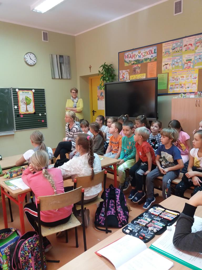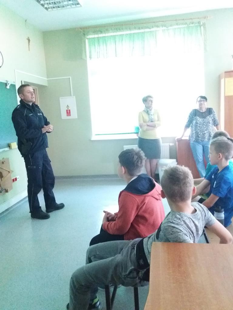 18 września 2019 r. gościliśmy w naszej szkole pana dzielnicowego Marcina Nowaka, który mówił o zachowaniu bezpieczeństwa w drodze do szkoły. Pan policjant omówił zasady bezpiecznego uczestnictwa w ruchu drogowym, w jaki sposób należy poruszać się po chodniku, jezdni, a także jak prawidłowo przechodzić przez jezdnię, korzystać z sygnalizacji świetlnej i jeździć rowerem. Uczniowie utrwalili sobie wszystkie informacje, zadawali naszemu gościowi mnóstwo pytań. Spotkanie przyczyniło się do wzrostu świadomości zachowań ryzykownych oraz bezpiecznych wśród dzieci.